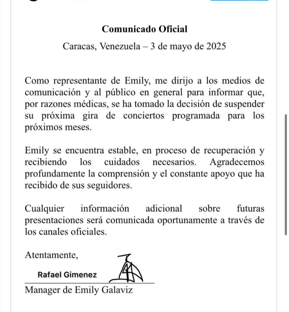 «Como representante de Emily, me dirijo a los medios de comunicación y al público en general para informar que, por razones médicas, se ha tomado la decisión de suspender su próxima gira de conciertos programada para los próximos meses», reza el texto.