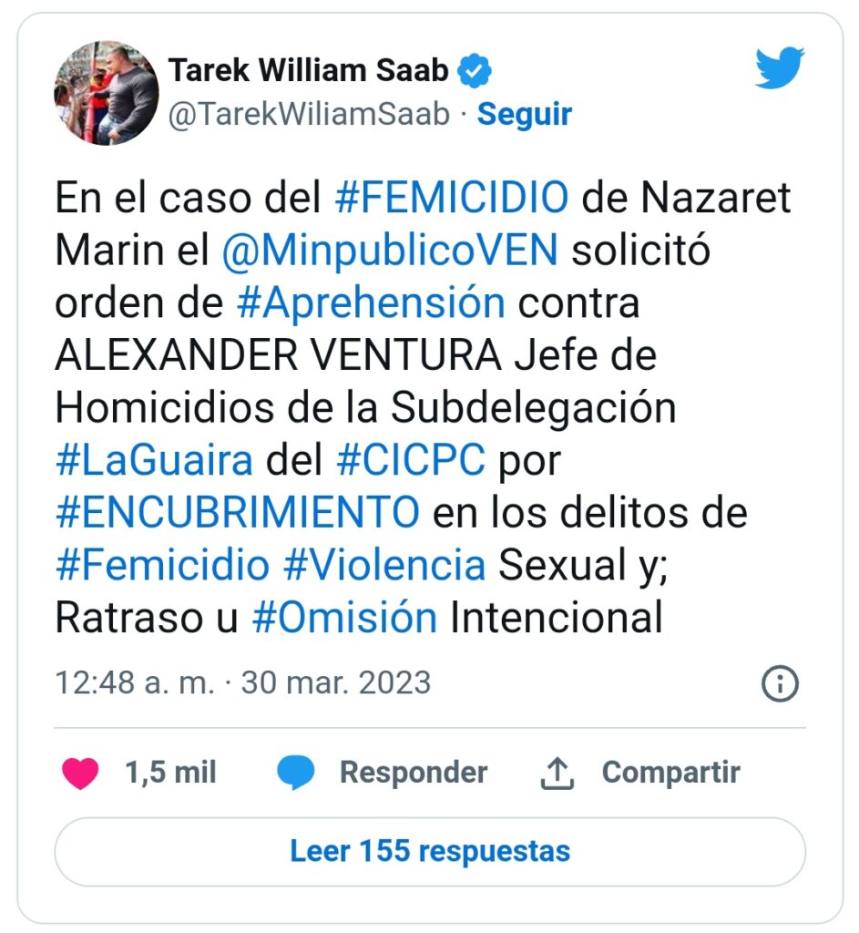 El Ministerio Público (MP), dictó orden de captura contra Alexander Ventura, jefe de homicidios de la subdelegación de La Guaira del Cicpc, por estar relacionado con el caso de la joven Nazareth Marín, quien fue asesinada en una playa de dicho estado.