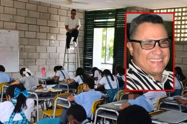 Un profesor del colegio Edgardo Vives Campo en Santa Marta se hizo viral en redes sociales luego de que publicara una foto en la que se le ve sentado en la cima de una escalera metálica dentro del aula de clases mientras supervisaba un examen.