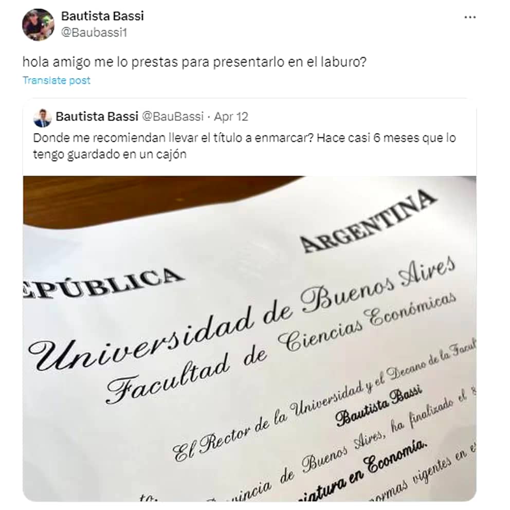 Bautista Bassi notó que su tocayo, que contaba con un título universitario de economista de la Universidad de Buenos Aires (UBA), buscaba recomendaciones para enmarcar el documento. Con mucha rapidez y humor el chico, aprovechando la coincidencia, le pidió prestado el título para presentarlo en su trabajo. “Hola amigo. ¿Me lo prestas para presentarlo en el laburo?”, escribió en un comentario en la publicación de su tocayo.