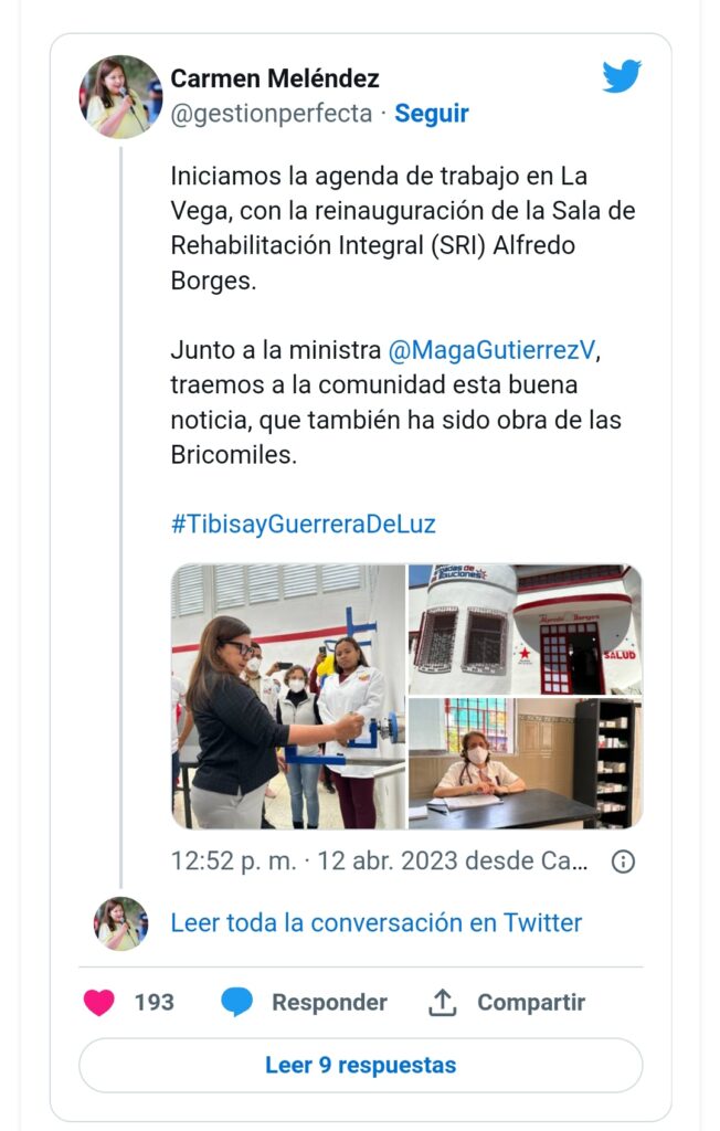 La alcaldesa del municipio libertador de Caracas, Carmen Meléndez, entregó a la comunidad de La Vega la Sala de Rehabilitación Integral (SRI), Alfredo Borges, la cual fue restaurada en su totalidad, como parte de la agenda de trabajo que adelanta su gestión.