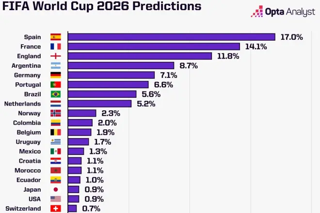 Por otra parte, Brasil, el otro gigante sudamericano y pentacampeón, se encuentra más rezagado en la séptima posición con apenas un 5,6% de probabilidades, según Opta. A pesar de contar con una plantilla de figuras de talla mundial y bajo la futura dirección de Carlo Ancelotti, las proyecciones estadísticas reflejan cautela basada en sus actuaciones recientes.
