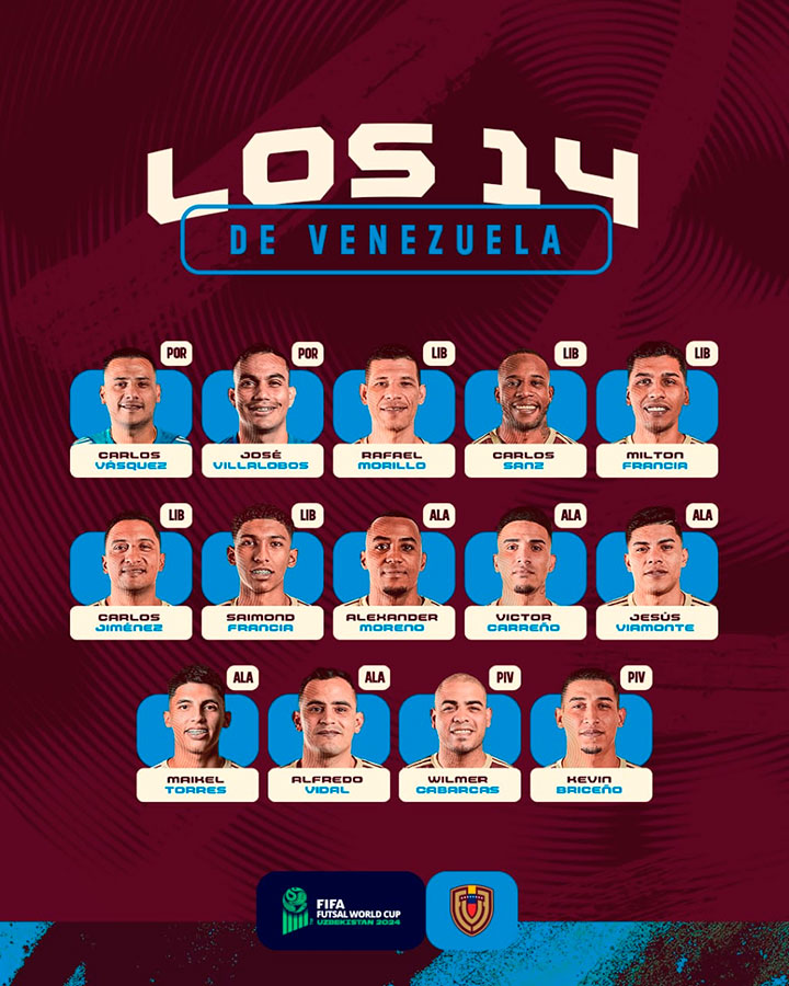 La Vinotinto futsal absoluta anunció la convocatoria oficial de los 14 jugadores que representarán a Venezuela en la próxima Copa Mundial de Futsal de la FIFA, que se celebrará en Uzbekistán del 14 de septiembre al 6 de octubre de 2024.