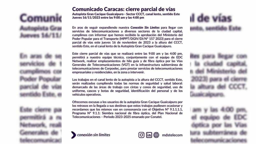 La información se dio a conocer mediante un comunicado, donde la empresa de telecomunicaciones Conexión Sin Límites informó que cuentan con la aprobación del Ministerio del Transporte para que el equipo técnico ejecute el emplazamiento de hilo de guía y de fibra óptica por las vías Generales de Telecomunicaciones en la infraestructura subterránea de telecomunicaciones de Corpoelec para prestar servicios a empresas y residencias, en la zona a intervenir.