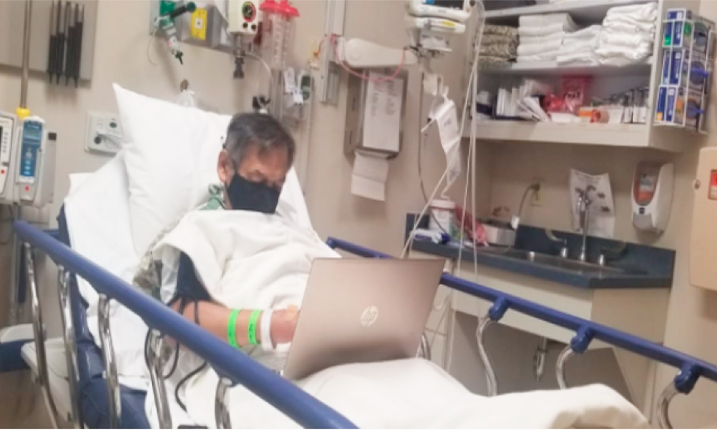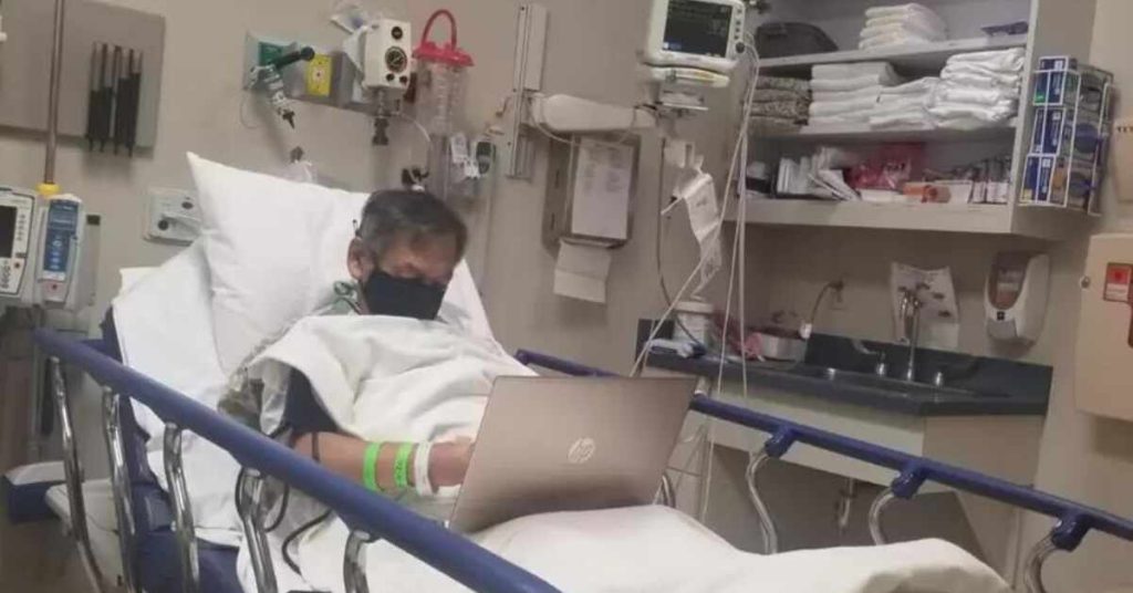 Acompañado de la imagen de su padre postrado en una cama de hospital con su computadora calificando los exámenes de sus estudiantes, que le ha dado la vuelta al mundo.