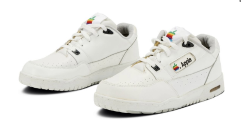 Con la manzana arcoíris del logo de Apple en la lengüeta y a un costado, los tenis blancos se confeccionaron especialmente para los empleados de la compañía como un obsequio único en una Conferencia Nacional de Ventas a mediados de la década de 1990.