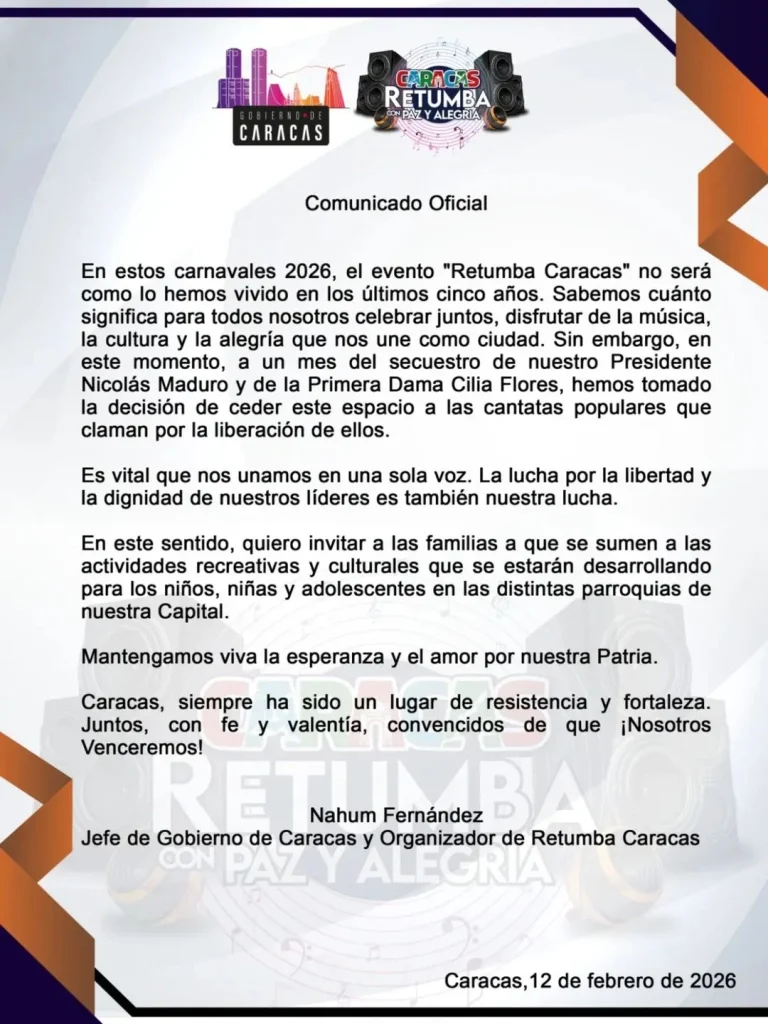 A través de un comunicado, el Gobierno de Caracas anunció que el evento musical “Retumba Caracas” cederá su espacio, en estos Carnavales 2026, a las cantatas populares por la liberación del presidente constitucional Nicolás Maduro y la primera combatiente, Cilia Flores, tras la agrêsión militar del pasado 3 de enero.