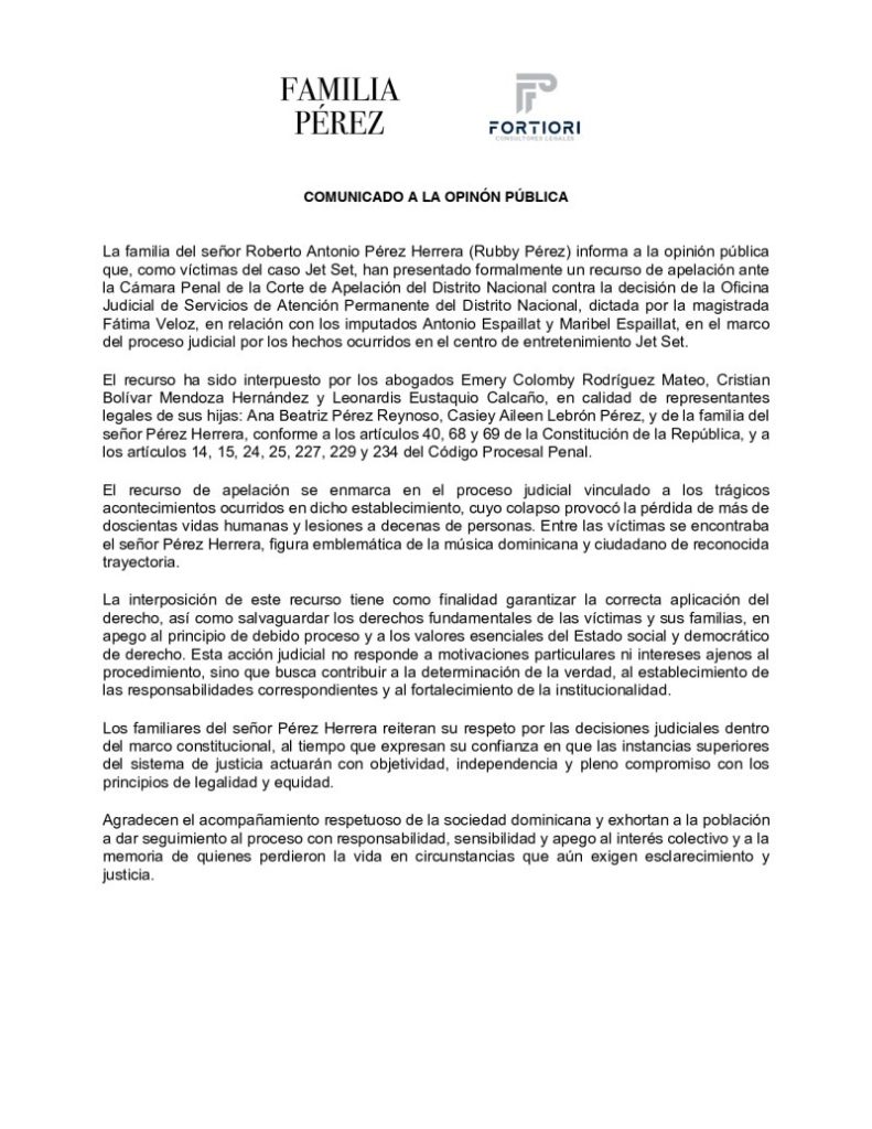 La familia del cantante dominicano Rubby Pérez informó este viernes que habían presentado un recurso de apelación contra la medida de coerción impuesta a Antonio y Maribel Espaillat en el caso del derrumbë de la discoteca Jet Set.