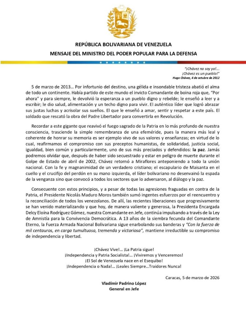 Padrino López enfatizó que la forma más coherente de honrar su memoria es practicar sus enseñanzas a través del compromiso con los preceptos humanistas, la solidaridad y, fundamentalmente, la preservación de la paz. Asimismo, señaló que el legado de Chávez permanece vigente en el llamado constante al diálogo y la unión nacional, principios que continúan orientando el rumbo estratégico y social del país en la actualidad.