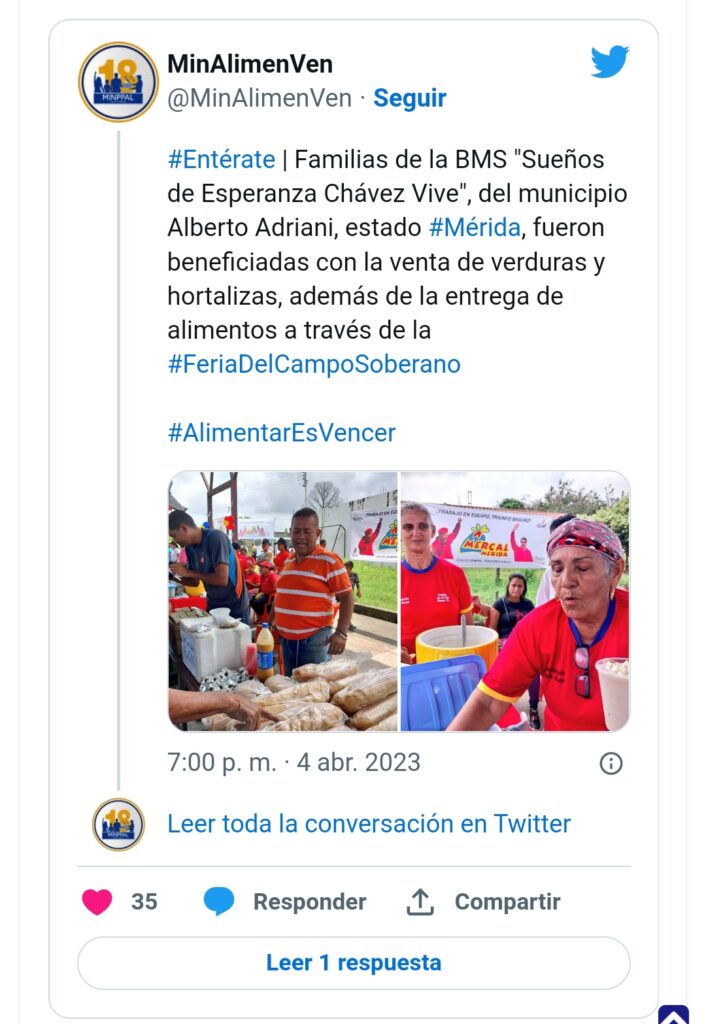 Familias de la Base de Misiones Socialistas (BMS), “Sueños de Esperanza Chávez vive”, fueron favorecidas con la venta de verduras y hortaliza y la distribución de alimentos a través de la Feria del Campo Soberano en el estado Mérida, como parte de las acciones del Gobierno nacional para garantizar que el pueblo tenga acceso a rubros de primera necesidad a precios justos.
