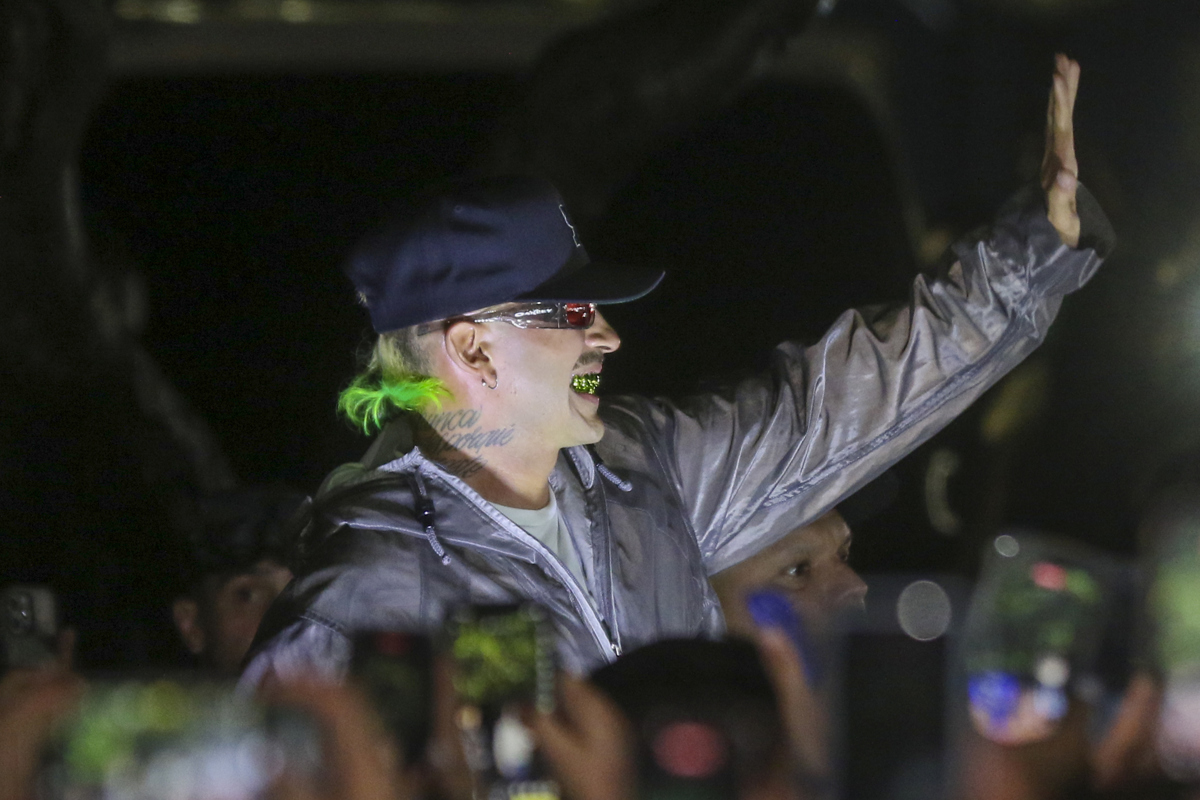 Centenares de fanáticos se congregaron en la Plaza Botero, soportando la intensa lluvia y las largas filas, para acompañar al artista, que apareció con su característico color verde en los accesorios: cinturón, gorra y zapatos.