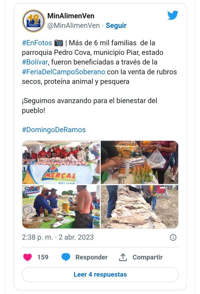 Con el despliegue de la Feria del Campo soberano fueron favorecidas más de seis mil familias de la parroquia Pedro Cova, municipio Piar del estado Bolívar. Durante dicha actividad, se realizó la venta de rubros secos, proteína animal y pesquera.