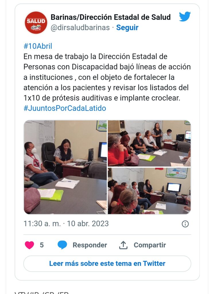 El equipo del Ministerio del Poder Popular para la Salud (MPPS), en el estado Barinas, realizó una mesa de trabajo este lunes, para fortalecer la atención a las personas con discapacidad auditiva en la entidad territorial. La información fue suministrada por la Dirección Estadal de Salud a través de sus redes sociales.