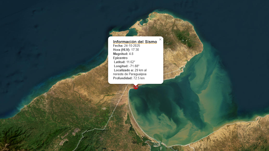 La Fundación Venezolana de Investigaciones Sismológicas (Funvisis) informó que a las 5:30 de la tarde de este viernes se registró un sismo de magnitud 4,8 en el estado Zulia, específicamente al noreste de Paraguaipoa, en el municipio Guajira.