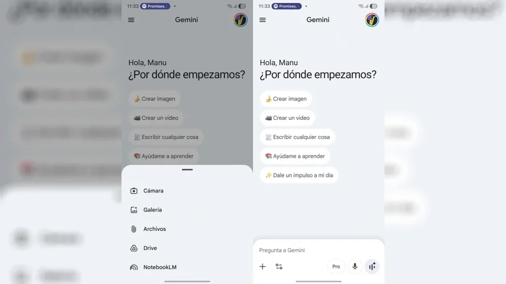 Anteriormente, según 9to5Google, esta lista ubicaba los botones de Cámara, Galería, Archivos y Drive de forma lateral con la forma de cápsulas. Ahora, con la integración del «NotebookLM», la interfaz se convierte en una lista estándar al igual que la misma de las herramientas o la selección del modelo de IA de Gemini.