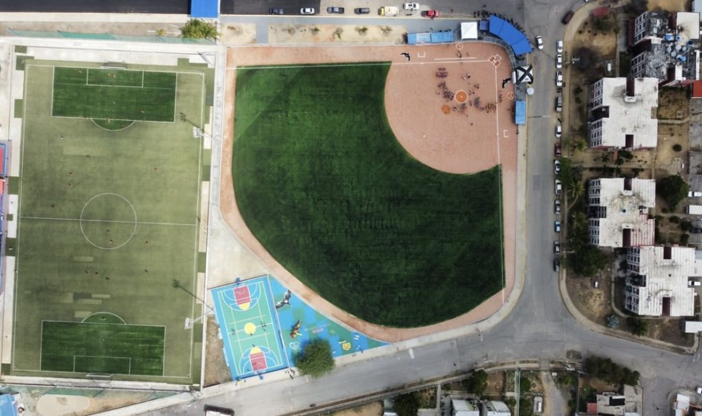 También se rehabilitaron las gradas, se colocaron 5.950 m2 de grama artificial, 2.850 m2 de material granular para el sistema de drenaje, sustitución total de la malla de alfajol para el cercado perimetral, renovación de aceras y brocales alrededor del campo, entre otros.