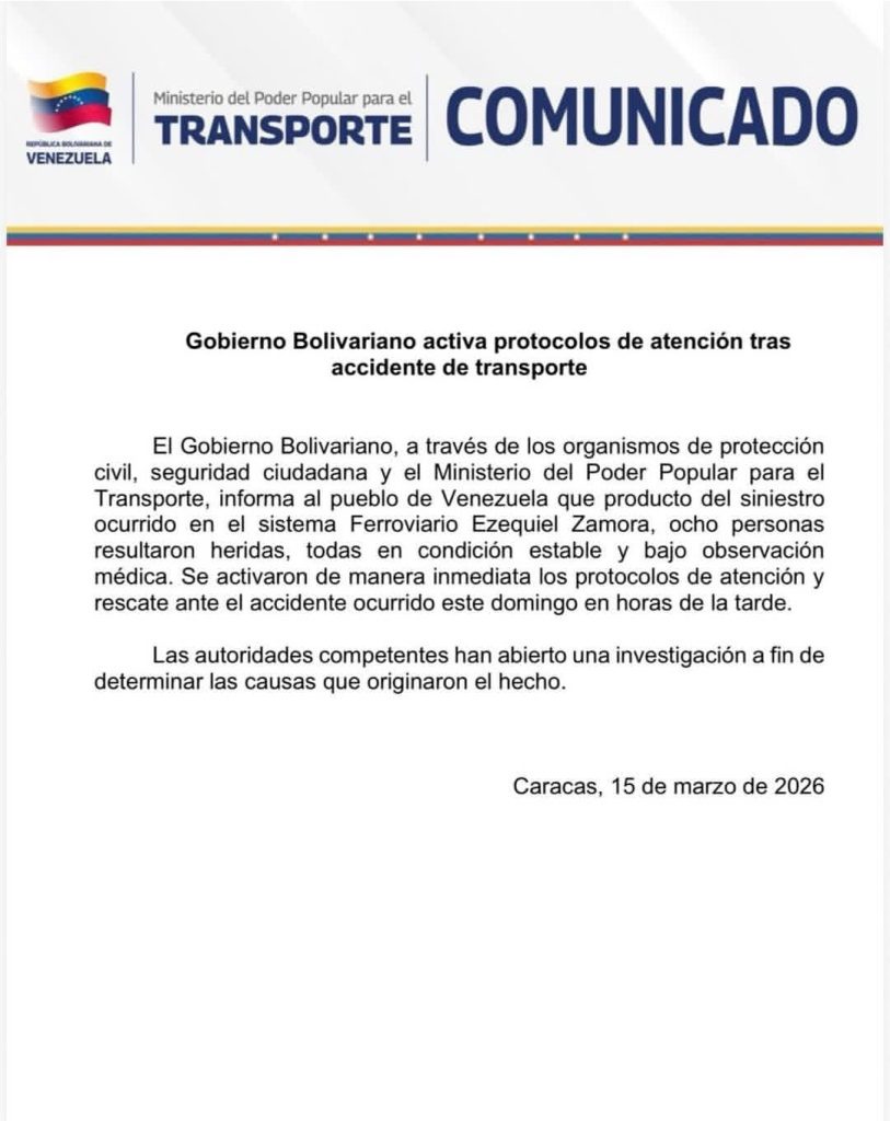 «El Gobierno Bolivariano, a través de los organismos de protección civil, seguridad ciudadana y el Ministerio del Poder Popular para el Transporte, informa al pueblo de Venezuela que producto del sinïestro ocurrido en el sistema de Ferroviario Ezequiel Zamora, ocho personas resultaron herïdas, todas en condición estable y bajo observación médica», suscribe el texto.