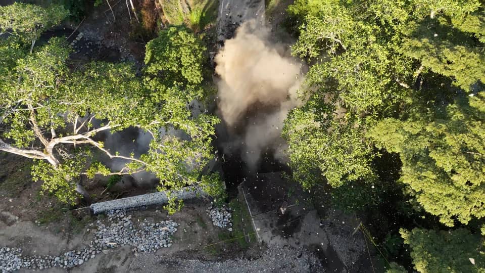 “Ahora nos encontramos en el Puente del Bongo en el acto de demolición con explosivös del puente colapsado para seguir avanzando en los trabajos de reconstrucción y restablecer el acceso por esta importante arteria vial del estado”, expresó el mandatario en sus redes sociales.