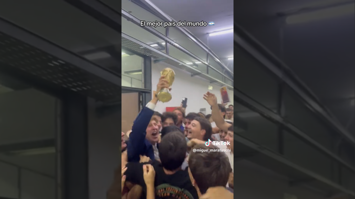 El recibimiento en el pasillo de la facultad fue una verdadera fiesta. Entre aplausos, cánticos, espuma y una lluvia de papelitos, el flamante graduado fue levantado en andas por sus amigos y compañeros de estudio. El punto culminante del festejo llegó cuando, imitando a los campeones del mundo en Qatar 2022, el joven alzó una réplica de la Copa del Mundo con orgullo y emoción, mientras la multitud coreaba las clásicas canciones de la hinchada argentina.