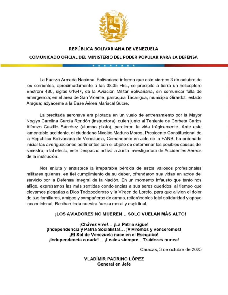 Este viernes, 3 de octubre, un helicóptero de entrenamiento de la Aviación Militar Bolivariana se estrËlló en el sector San Vicente, Maracay, estado Aragua. En tal sentido, el ministro para la Defensa, Vladímir Padrino López, confirmó el siniestrÖ por sus redes sociales a través de un comunicado.