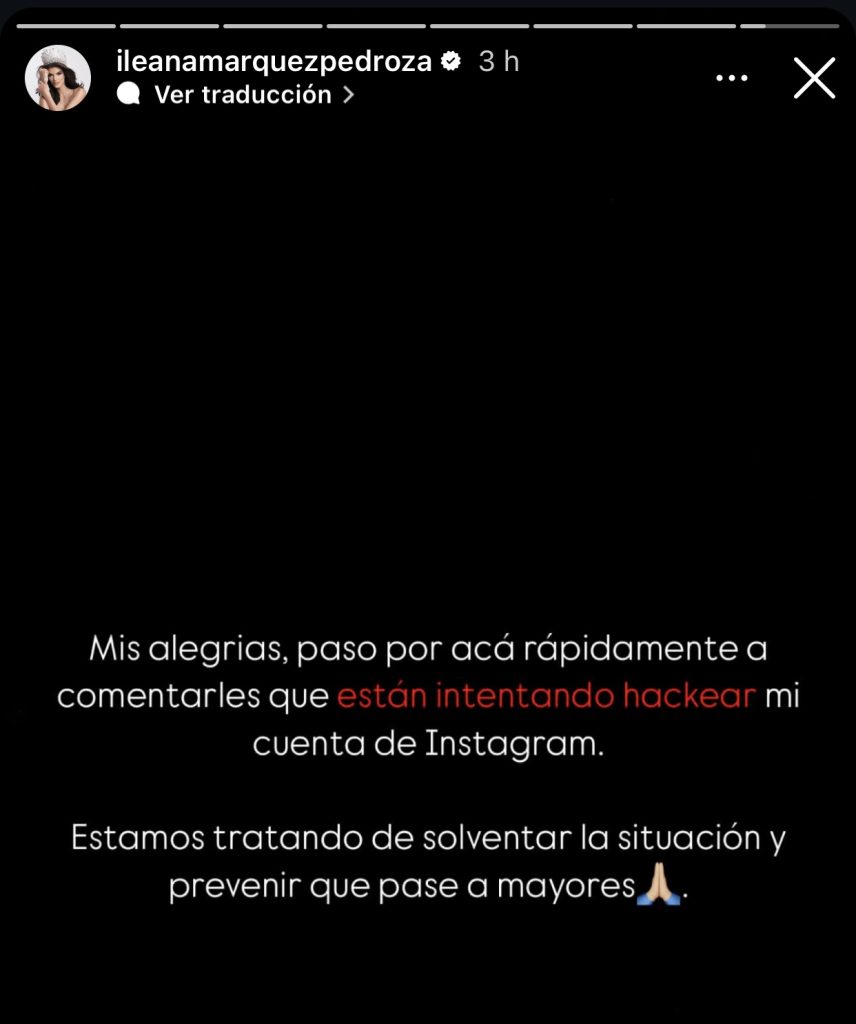 “Mis alegrías, paso por acá rápidamente a comentarles que están intentando hackear mi cuenta de Instagram. Estamos tratando de solventar la situación y prevenir que pase a mayores”, escribió en sus historias.