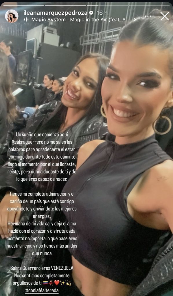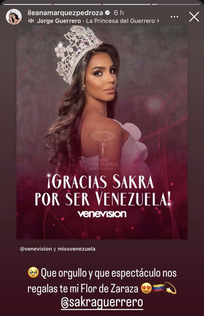 En sus historias de Instagram, la valenciana de 28 años de edad compartió una foto de Guerrero difundida por la organización del Miss Venezuela, con la finalidad de expresarle el orgullo que siente por ella por su participación en el grand slam de belleza.