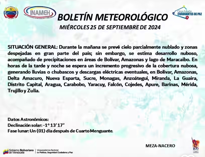 El Instituto Nacional de Meteorología e Hidrología (Inameh), destacó que este miércoles se presentará un cielo parcialmente nublado y zonas despejadas en la mayor parte del territorio nacional.