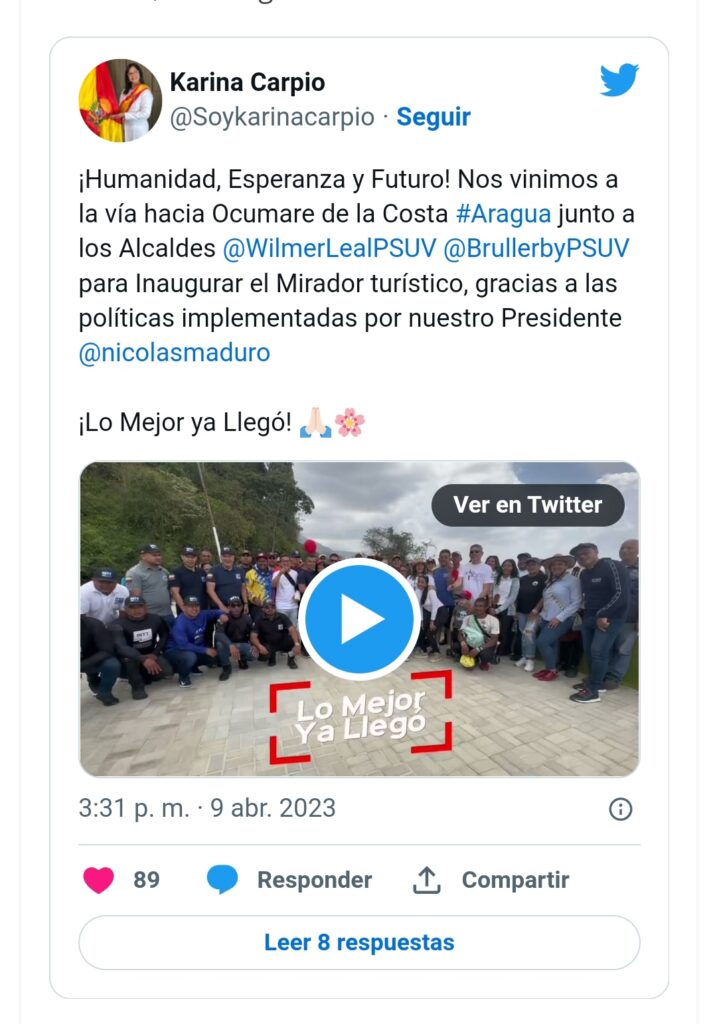En su cuenta en la red social Twitter, @Soykarinacarpio, indicó que “gracias a las políticas implementadas por el presidente de la República Bolivariana de Venezuela, Nicolás Maduro, se inauguró el mirador turístico.