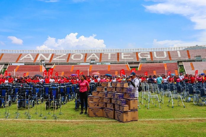 El gobernador Luis José Marcano, en compañía del organizador y el secretario nacional del Psuv, Pedro Infante y Fidel Vásquez, cedió unas 700 sillas de ruedas, 250 coches ortopédicos, bastones, andaderas, colchones antiescaras, glucómetros, tensiómetros, nebulizadores, entre otros equipos, a lideresas y líderes comunitarios de los 2 mil 283 sectores de la entidad.