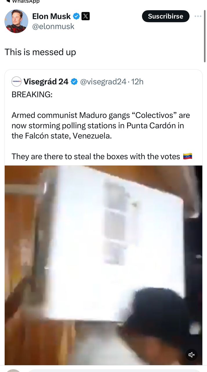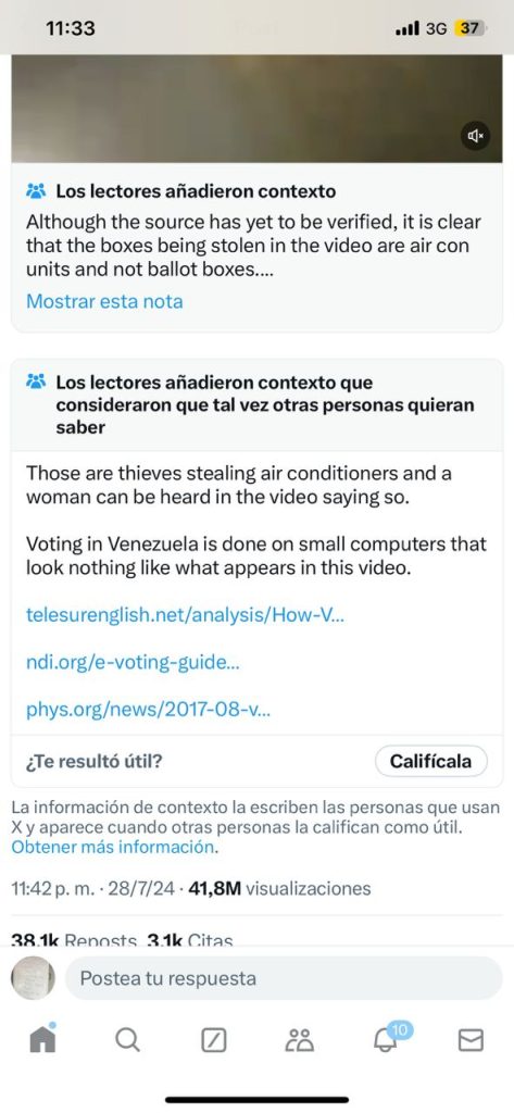 Ante este Fake News, la red social X comunicó a Elon Musk que la información es falsa, indicando que “son ladrones robando aires acondicionados y en el video se escucha una mujer decirlo”, al tiempo que aclaró “la votación en Venezuela se realiza en pequeños computadores que no se parecen en nada a lo que aparece en este video”.
