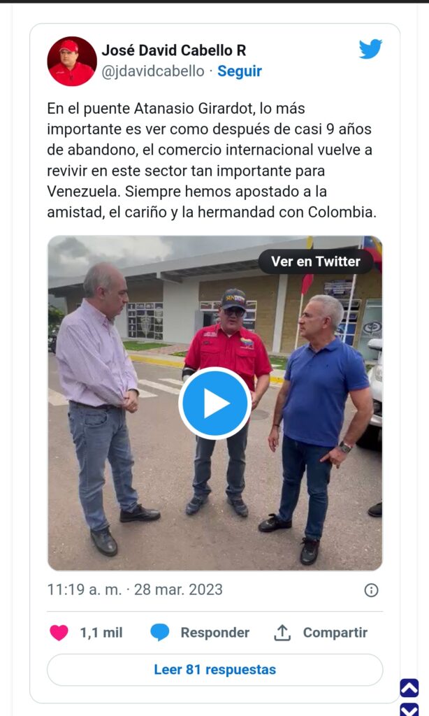 En su cuenta en la red social Twitter, @jdavidcabello, indicó que «en el puente Binacional “Atanasio Girardot”, lo más importante es ver como después de casi nueve años de abandono, el comercio internacional revive en esta importante área de Venezuela».