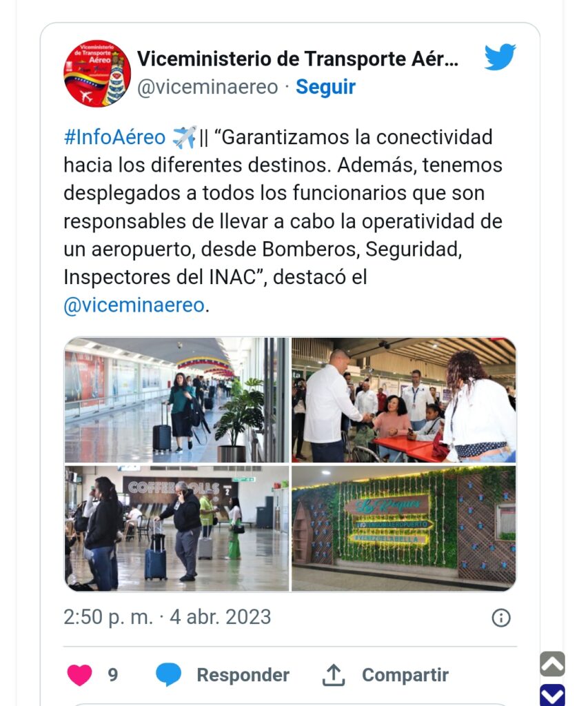 En la cuenta de la red social Twitter del viceministerio del Transporte Aéreo, @viceminaereo, se informó que el aeropuerto garantiza la conectividad hacia los diferentes destinos de Venezuela.