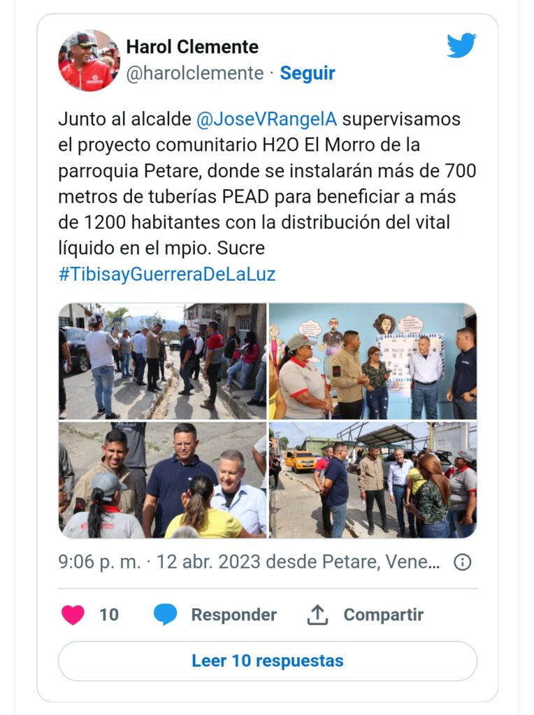 La información fue publicada por Clemente en la cuenta Twitter, donde, además, se conoció que la inspección se llevó a cabo junto al alcalde de Sucre, José Vicente Rangel Ávalos, quien señaló que con este proyecto comunitario se consolida el compromiso del Gobierno nacional para ofrecerle a la población un servicio óptimo y de calidad.