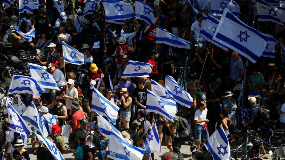 La marcha se celebra un día después de que Netanyahu prometió seguir adelante con la iniciativa, desafiando a los manifestantes, a las crecientes deserciones de reservistas militares y a los llamados del presidente de Estados Unidos, Joe Biden, a suspender el plan.