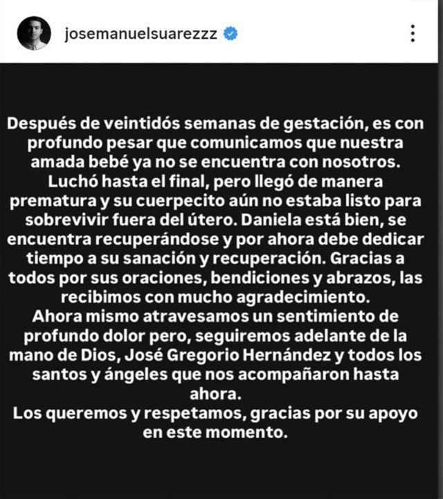 En la mañana de este domingo 22 de febrero, el reconocido actor venezolano José Manuel Suárez compartió a través de sus canales oficiales la lamentable noticia del fallecimïento de su hija, fruto de su unión con la también actriz Daniela Alvarado.