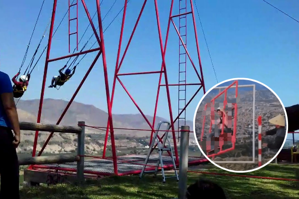 Todo iba bien, hasta que el juego se desprende de las bases y se ve caer al joven hacia el precipicio. Todos quedaron aterrorizados.