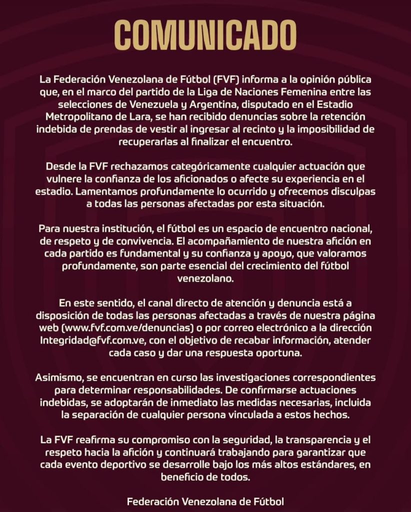 «Para la Federación Venezolana de Fútbol, el bienestar de nuestra hinchada es una prioridad absoluta. Lamentamos profundamente los inconvenientes causados y aseguramos que estamos trabajando para identificar a los responsables de este accionar ajeno a nuestros valores institucionales», reza el comunicado oficial.