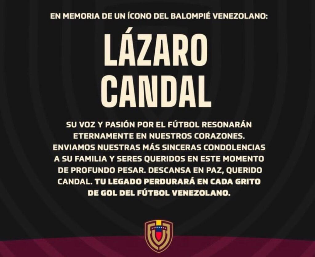 “Su voz y pasión por el fútbol resonarán eternamente en nuestros corazones. Enviamos nuestras más sinceras condolencias a su familia y seres queridos en este momento de profundo pesar. Descansa en paz, querido Candal. Tu legado perdurará en cada grito de gol del fútbol venezolano” manifestó la fotografía publicada en el Instagram de Jorge Andrés Giménez Ochoa.