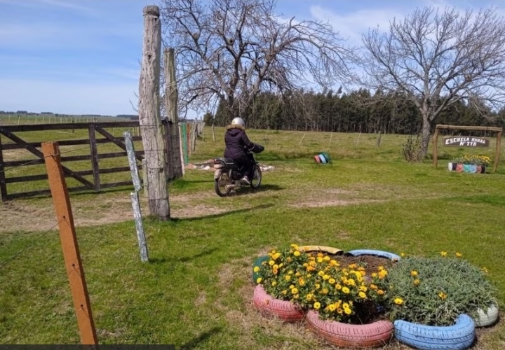 María se sube a la moto, hace un kilómetro y medio para meterse en un sinuoso camino de tierra en el que pasa por otra escuela rural, por una estación de trenes abandonada desde la década de 1990 y cuyas vías están tapadas por el pasto, y recorre 12 kilómetros hasta llegar a las 9:45, 9:50, con un breve margen para abrir el local y aguardar el arribo de Juliana y Benjamín para, a las 10, iniciar la clase.