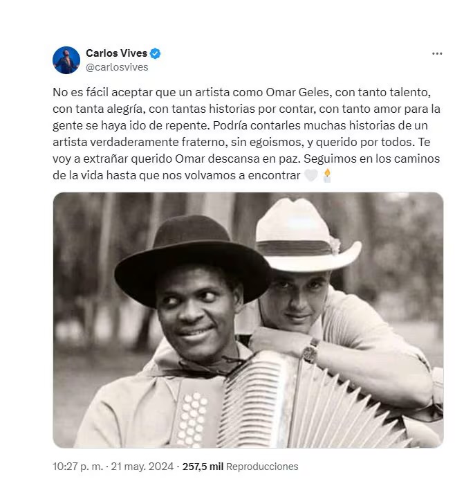 “No es fácil aceptar que un artista como Omar Geles, con tanto talento, con tanta alegría, con tantas historias por contar, con tanto amor para la gente se haya ido de repente (sic)”, expresó el artista samario en su cuenta oficial de la red social X.