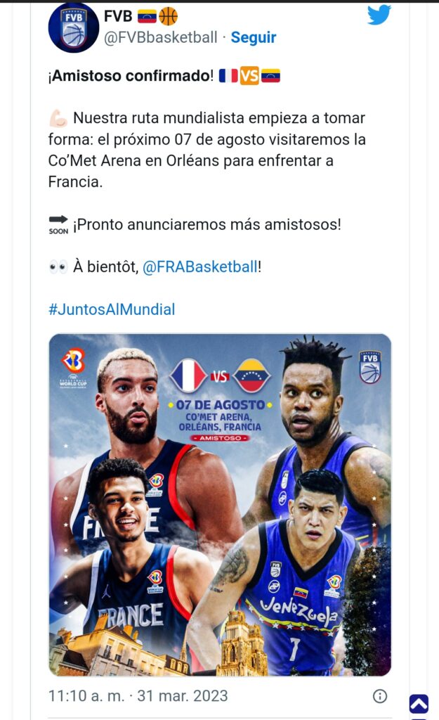 La Federación Venezolana de Baloncesto (FVB), informó que la Vinotinto tendrá un partido amistoso contra el combinado nacional de Francia.