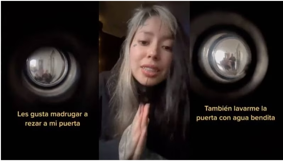 En el mismo video se puede observar como a través de la puerta de su casa están las señoras rezando. “Les gusta madrugar a rezar en mi puerta y lavármela con agua bendita”.