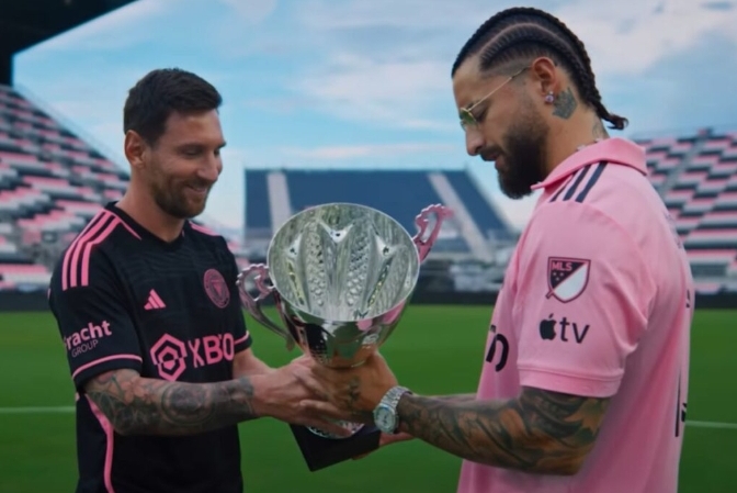 En las escenas en que apareció con Messi se ve al rosarino entrando al césped del estadio con el uniforme alternativo de la franquicia de Florida mientras sostiene un trofeo.