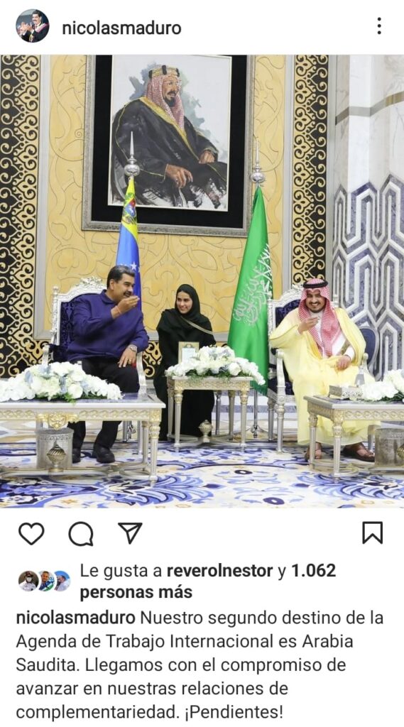 A través de su cuenta en la red social Instagram, el presidente Maduro informó que «nuestro segundo destino de la Agenda de Trabajo Internacional es Arabia Saudita. Llegamos con el compromiso de avanzar en nuestras relaciones de complementariedad. ¡Pendientes!».