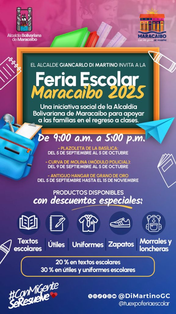 La Alcaldía de Maracaibo anunció la puesta en marcha de una feria escolar que se extenderá durante un mes con el fin de ofrecer a la ciudadanía artículos escolares a precios solidarios, en el marco del regreso a clases 2025-2026.