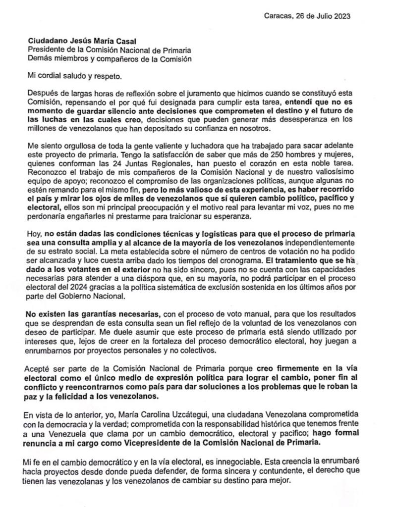 La vicepresidenta de la Comisión Nacional de Primaria (CNP), María Carolina Uzcátegui, renunció a esta instancia alegando que «hoy no están dadas las condiciones técnicas y logísticas para que el proceso de primaria sea una consulta amplia».
