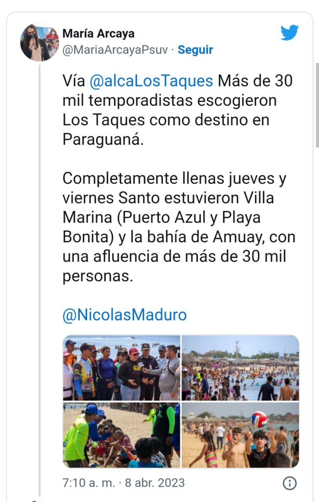 Mediante Twitter enfatizó que “más de 30 mil personas han visitado las costas de Villa Marina y Amuay en los últimos dos días”.