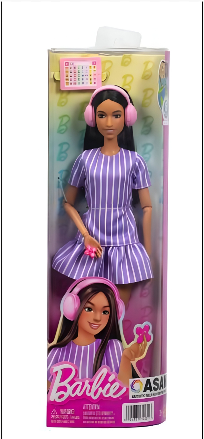 En las imágenes la Barbie con autïsmo aparece con tono de piel moreno, pelo negro largo, un vestido en color morado claro y rallas blancas, y audífonos rosados. Además, viene en una caja pequeña transparente con dos accesorios, los protectores auditivos y su dispositivo de comunicación.