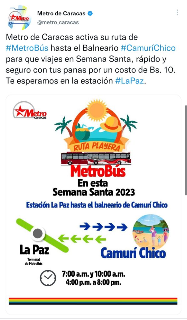 Metro de Caracas informó vía Twitter que activaron para esta Semana Santa una ruta de Metrobús hasta el balneario de Camuri Chico, en el estado La Guaira.