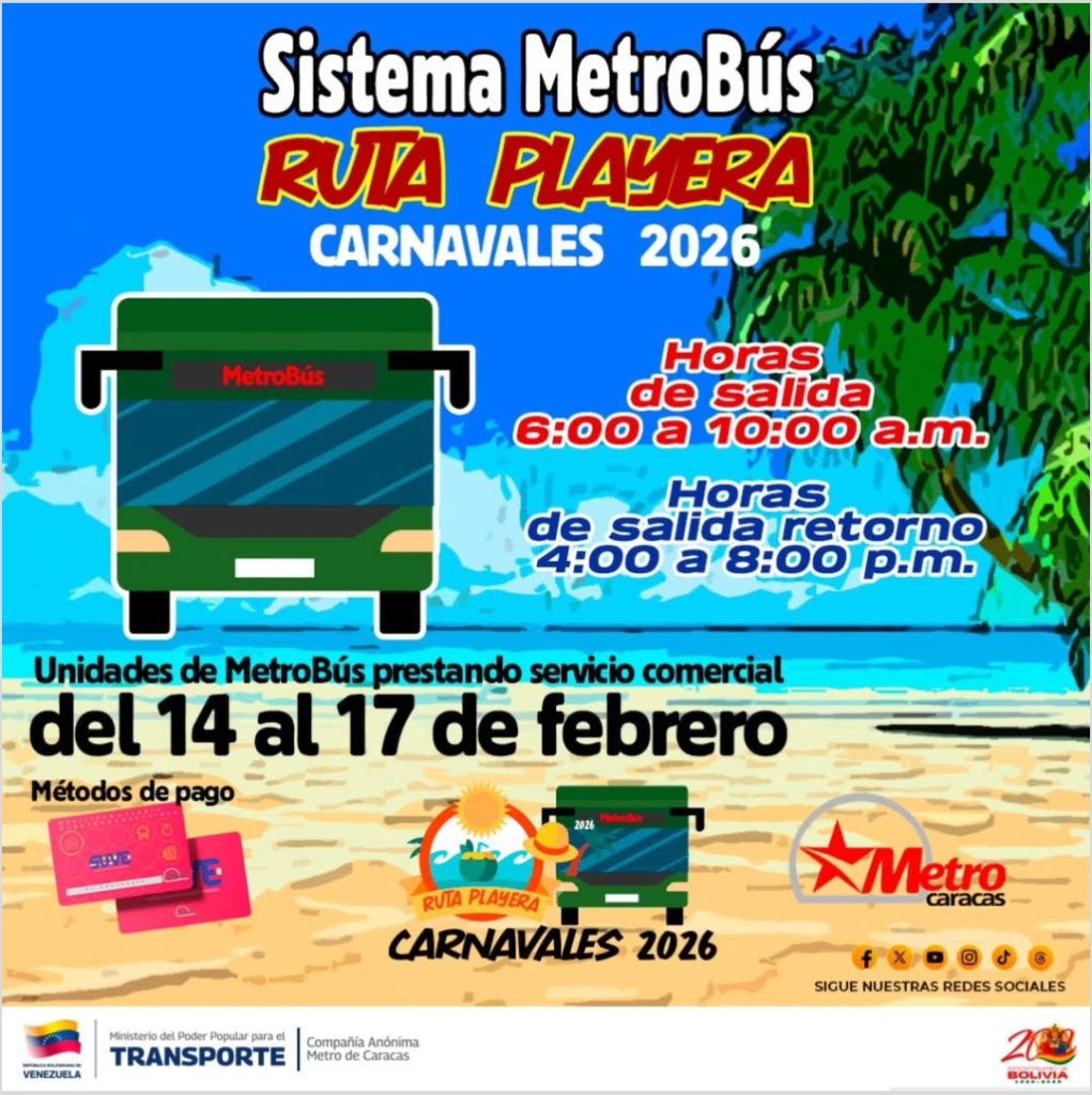 A partir del sábado 14 y hasta el martes 17 de febrero, el Metro de Caracas, nuevamente activará la Ruta Playera por los Carnavales 2026 para ofrecer el traslado cómodo y seguro de temporadistas hasta el estado La Guaira.